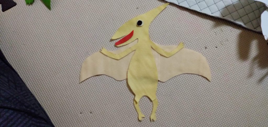 プテラノドンの足が変なところで切れているのは、18cm×18cmのフェルトしかなかったため、ツギハギでしか布を確保できませんでした。大きなサイズがある場合は一枚で取った方が綺麗です。