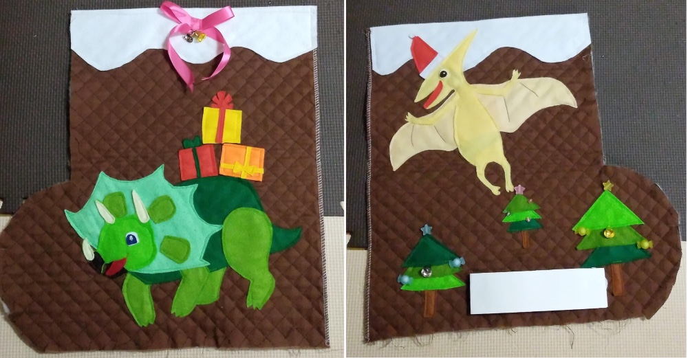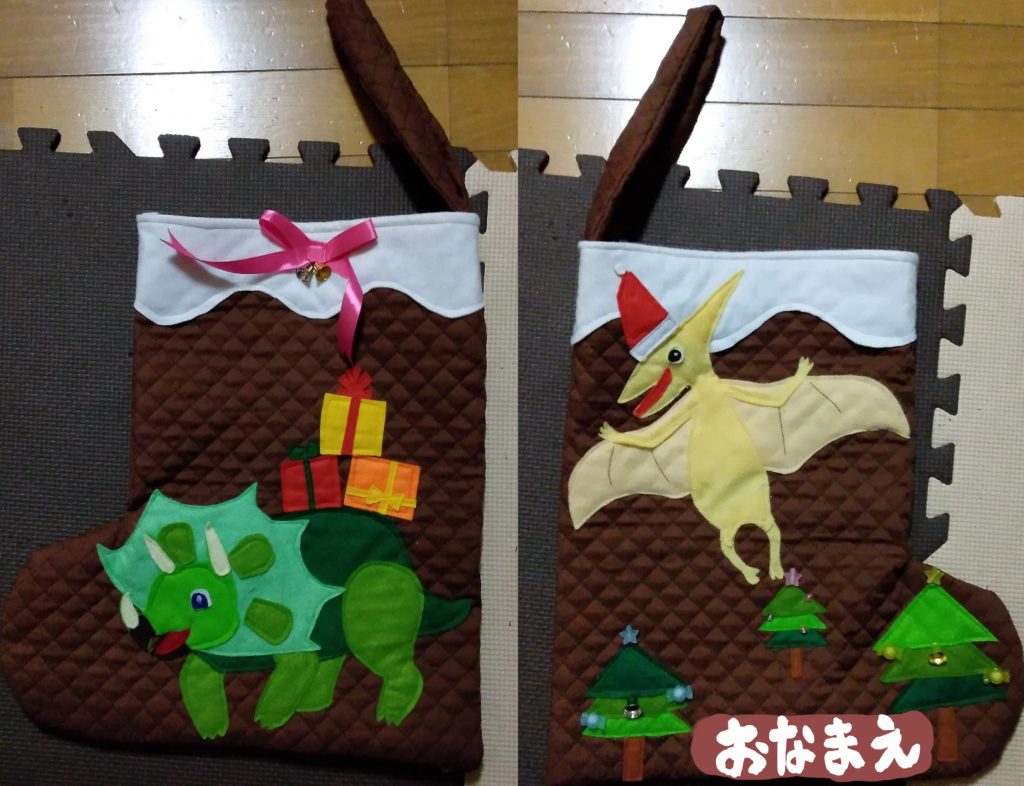 年中の息子に「クリスマスブーツの模様は何が良い?」と聞くと「トリケラトプスとプテラノドン!」と具体的な要求があったのでそれに決まり。