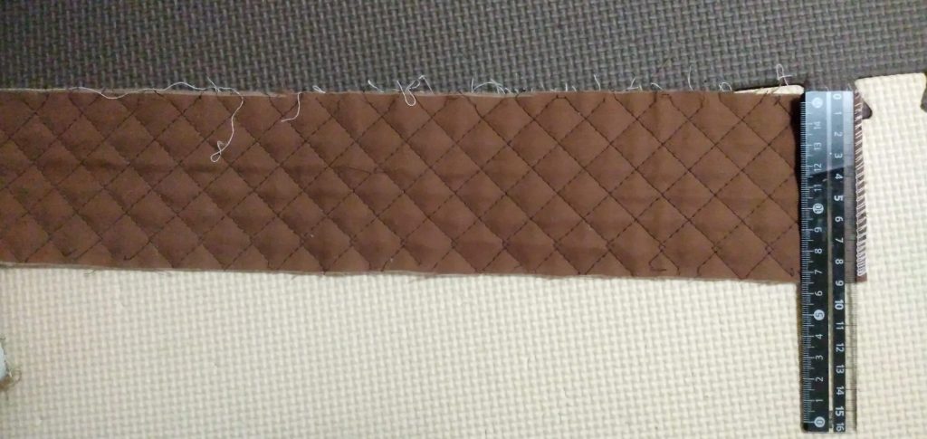 次は持ち手の部分を作っていきます。キルト生地の共布を使うと一体感が出てまとまりがでます。幅9cm長さはお好みで、持ち手に欲しい分だけ取ります。私は、50cm取りました。余りそうなら縫いつける時に調節するのもありです。